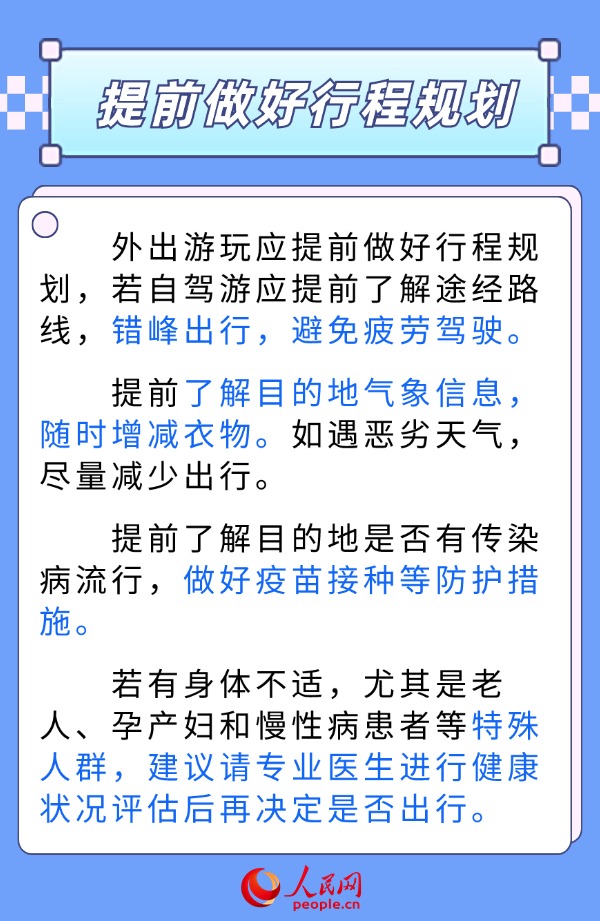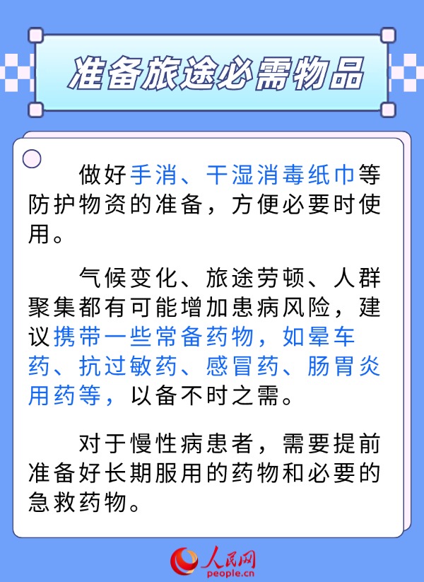 中秋假期臨近,短途游升溫。這期間人員流動和聚集性活動增多,傳染性疾病感染風險加大。同時,外出旅行可能會遇到天氣、住宿條件、衛(wèi)生環(huán)境、旅途勞累等因素影響,導(dǎo)致身體不適。假期出游如何做好健康防護?為此,人民網(wǎng)采訪了清華大學第一附屬醫(yī)院全科醫(yī)學科主任醫(yī)師姜岳。
