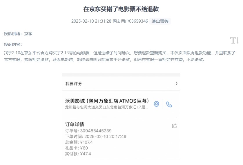 “我于2月10日在京東平臺購買的2月13日電影票,因選錯了時間場次,想要退款重新購買,不僅頁面沒有退款功能,官方客服也拒絕退款,聯(lián)系電影院,影院卻聲明只能在平臺退款?!边@是人民網(wǎng)“人民投訴”平臺用戶近日遇到的煩心事。
