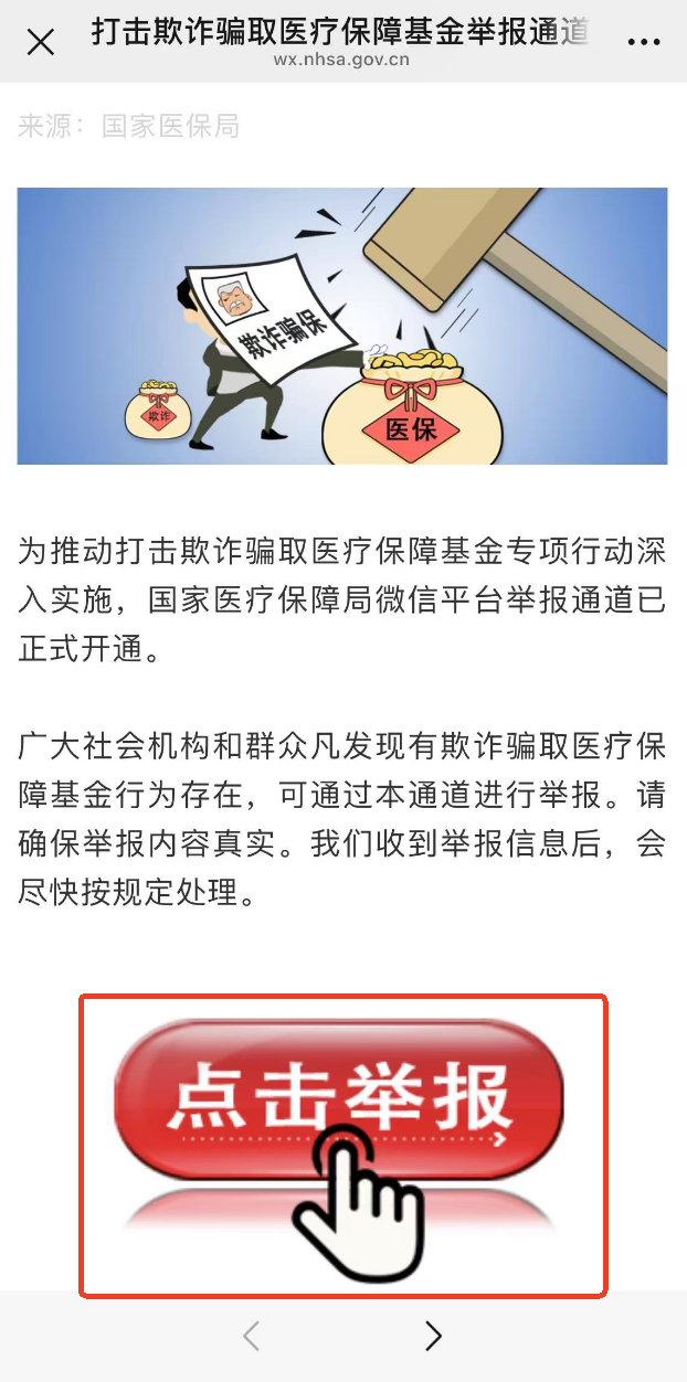 國(guó)家醫(yī)保局微信公眾號(hào)專(zhuān)門(mén)開(kāi)通了網(wǎng)上舉報(bào),廣大社會(huì)機(jī)構(gòu)和群眾凡發(fā)現(xiàn)有欺詐騙取醫(yī)療保障基金行為存在,通過(guò)國(guó)家醫(yī)保局微信公眾號(hào)首頁(yè)下方“政民互動(dòng)”版塊點(diǎn)擊“打擊欺詐騙保舉報(bào)”即可進(jìn)入,選擇“網(wǎng)上信訪”或“局長(zhǎng)信箱”反映相關(guān)情況。