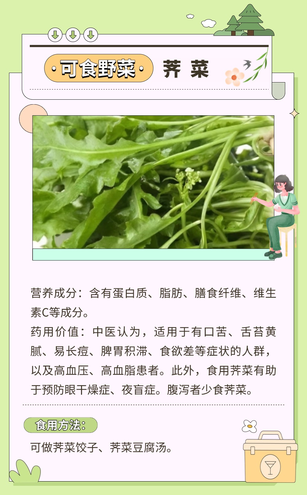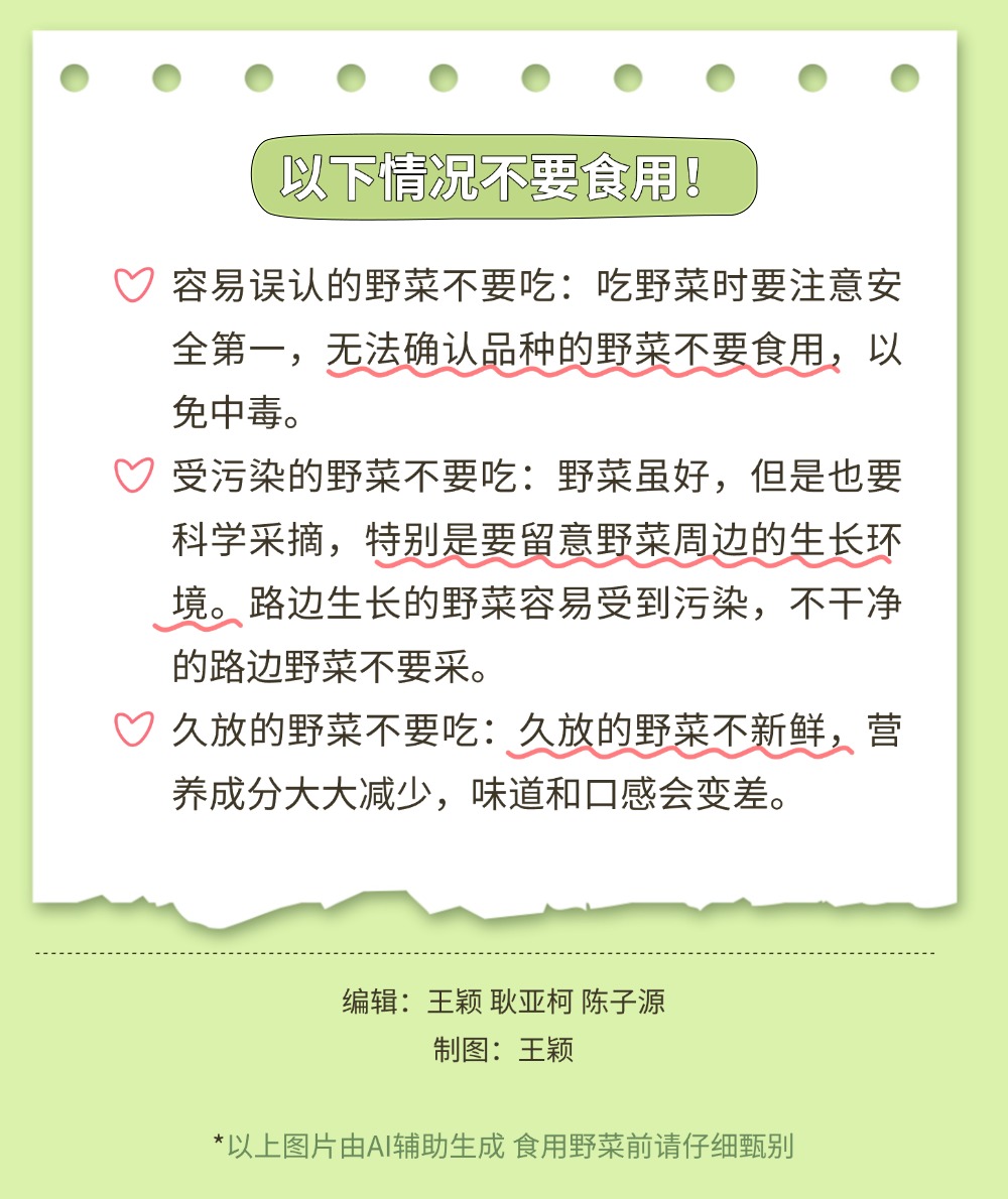 風(fēng)一吹,大地就悄悄藏好了禮物。那些不起眼的角落,冒頭的野菜正等著被認(rèn)領(lǐng)。有人說,挖野菜是成年人的“自然尋寶游戲”。貓著腰,撥開草叢,發(fā)現(xiàn)一簇鮮嫩的綠,像拆開大地饋贈的盲盒。如何將野菜吃得健康、吃得安全?一圖了解野菜的正確打開方式。