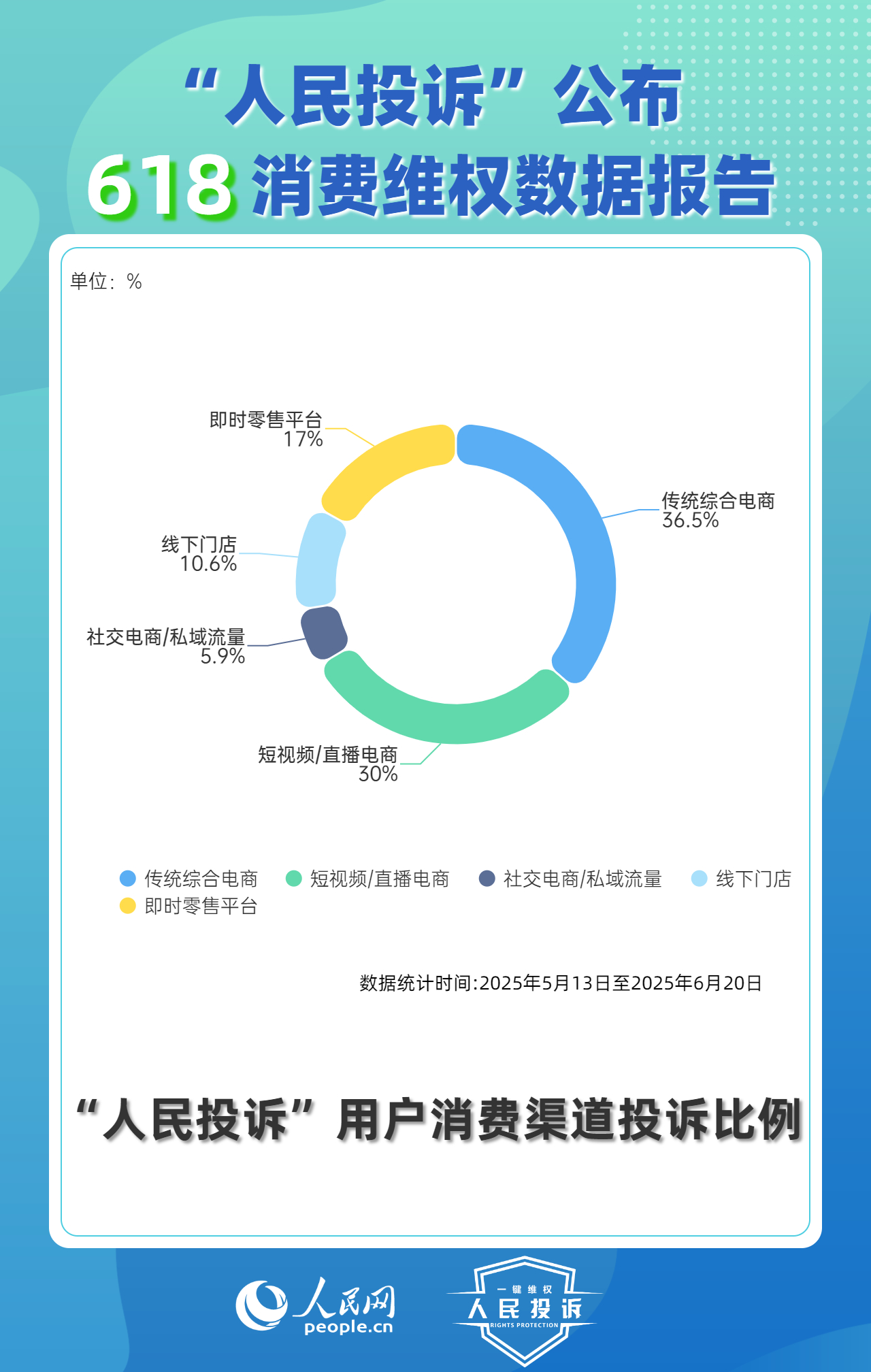 消費渠道投訴占比則為:傳統(tǒng)綜合電商36.5%、短視頻/直播電商30%、即時零售平臺17%、線下門店10.6%、社交電商/私域流量5.9%。