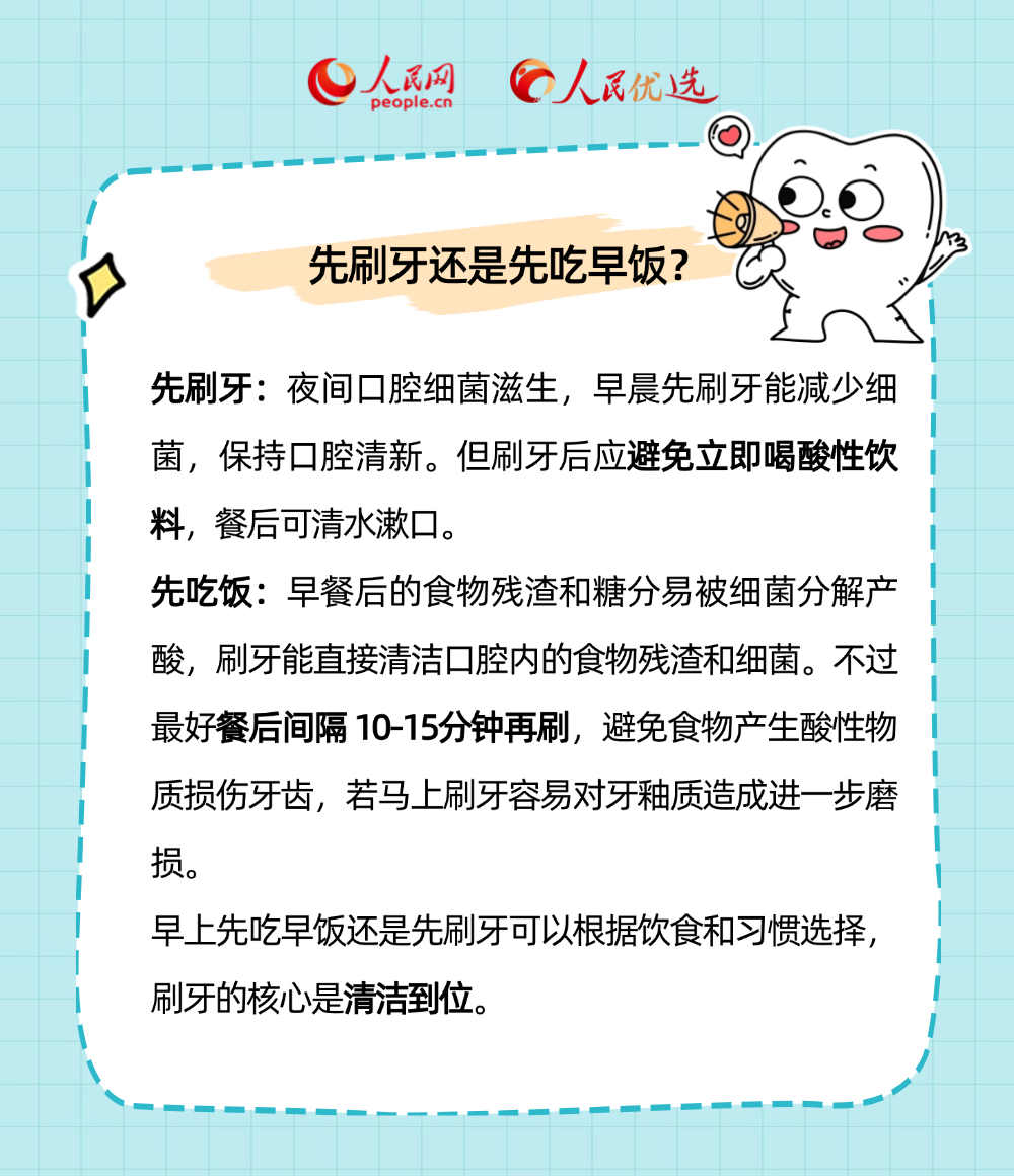 關(guān)于這個問題,中國口腔清潔護(hù)理用品工業(yè)協(xié)會科技委副主任委員陳敏珊說:先刷牙和先吃早飯,都是可以的。