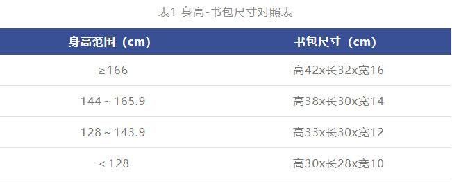 一是科學(xué)選擇書包。要根據(jù)身高選擇合適書包尺寸(表1),身高144厘米以下的,可選擇配有腰帶和胸帶的書包,分散重力,防止書包晃動過大造成脊柱傷害。