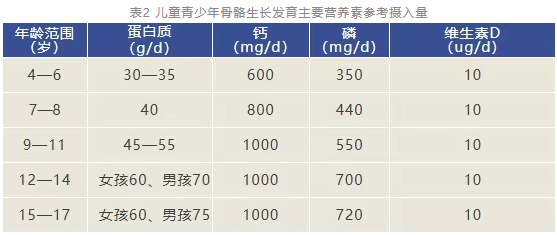 二是注意提供充足營養(yǎng)素。影響兒童青少年骨骼生長發(fā)育的主要營養(yǎng)素包括鈣、磷、維生素D和蛋白質(zhì)等,可參考表2為兒童青少年提供充足營養(yǎng)素。