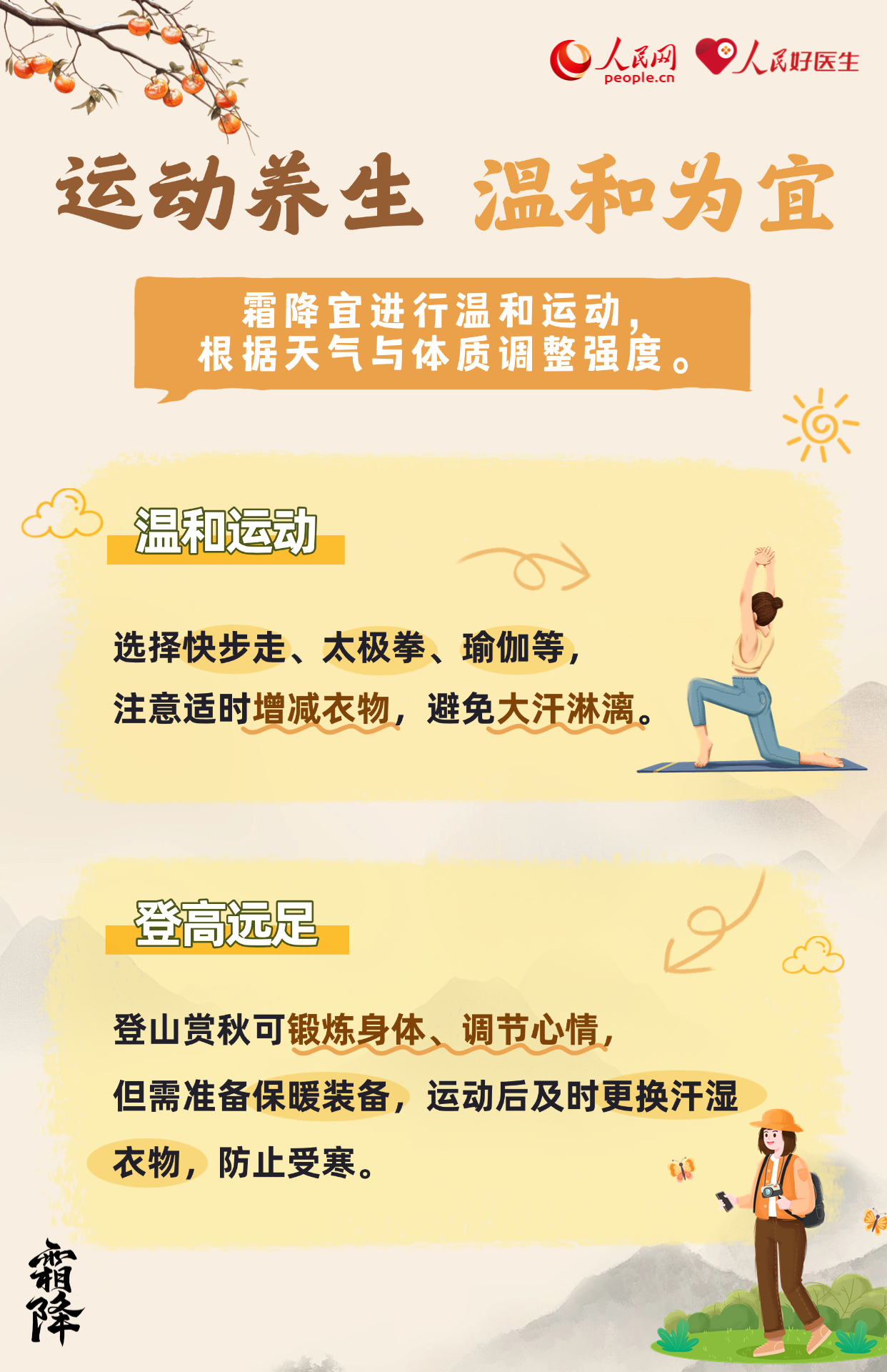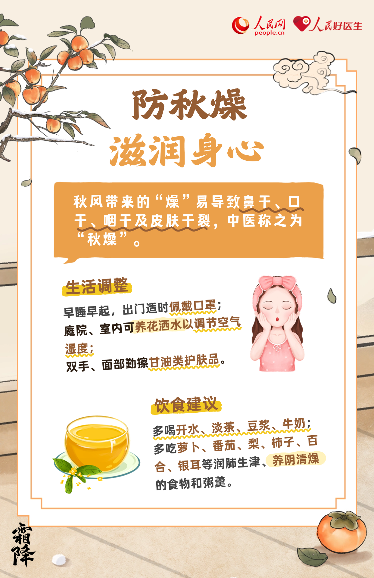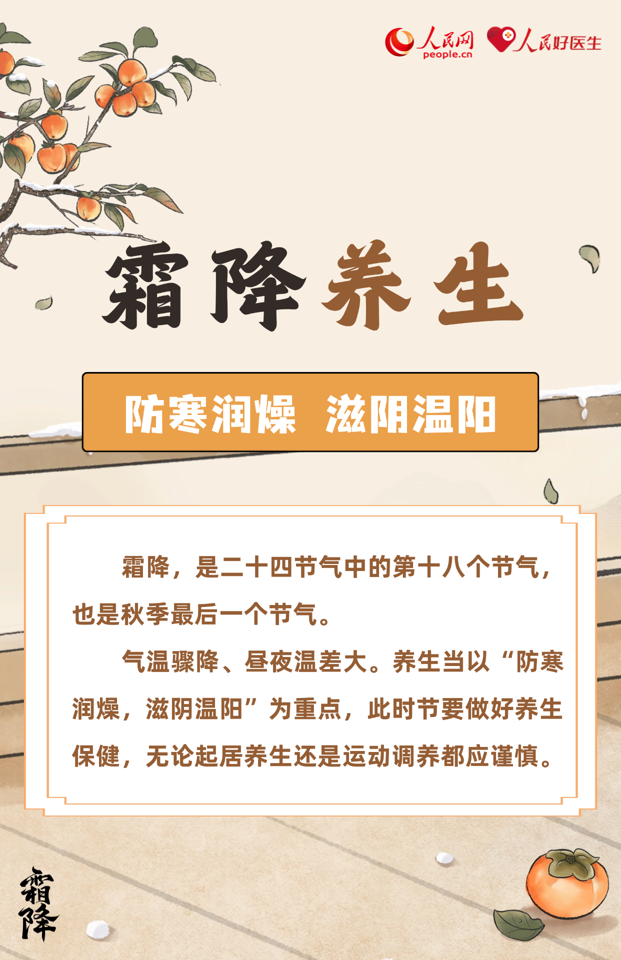 霜降,是二十四節(jié)氣中的第十八個節(jié)氣,也是秋季最后一個節(jié)氣。氣溫驟降、晝夜溫差大。養(yǎng)生當以“防寒潤燥,滋陰溫陽”為重點,此時節(jié)要做好養(yǎng)生保健,無論起居養(yǎng)生還是運動調(diào)養(yǎng)都應(yīng)謹慎,湖北省中醫(yī)院治未病中心主任醫(yī)師楊帆為大家?guī)砩钋镳B(yǎng)生攻略。