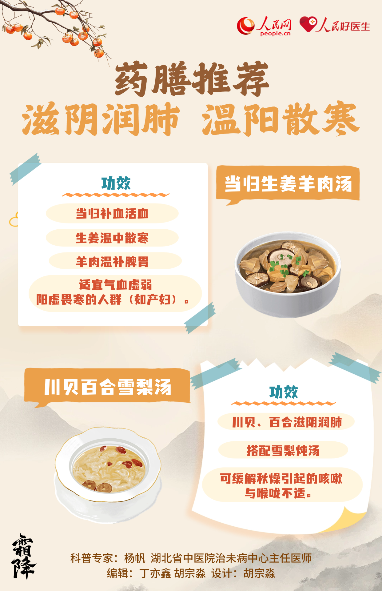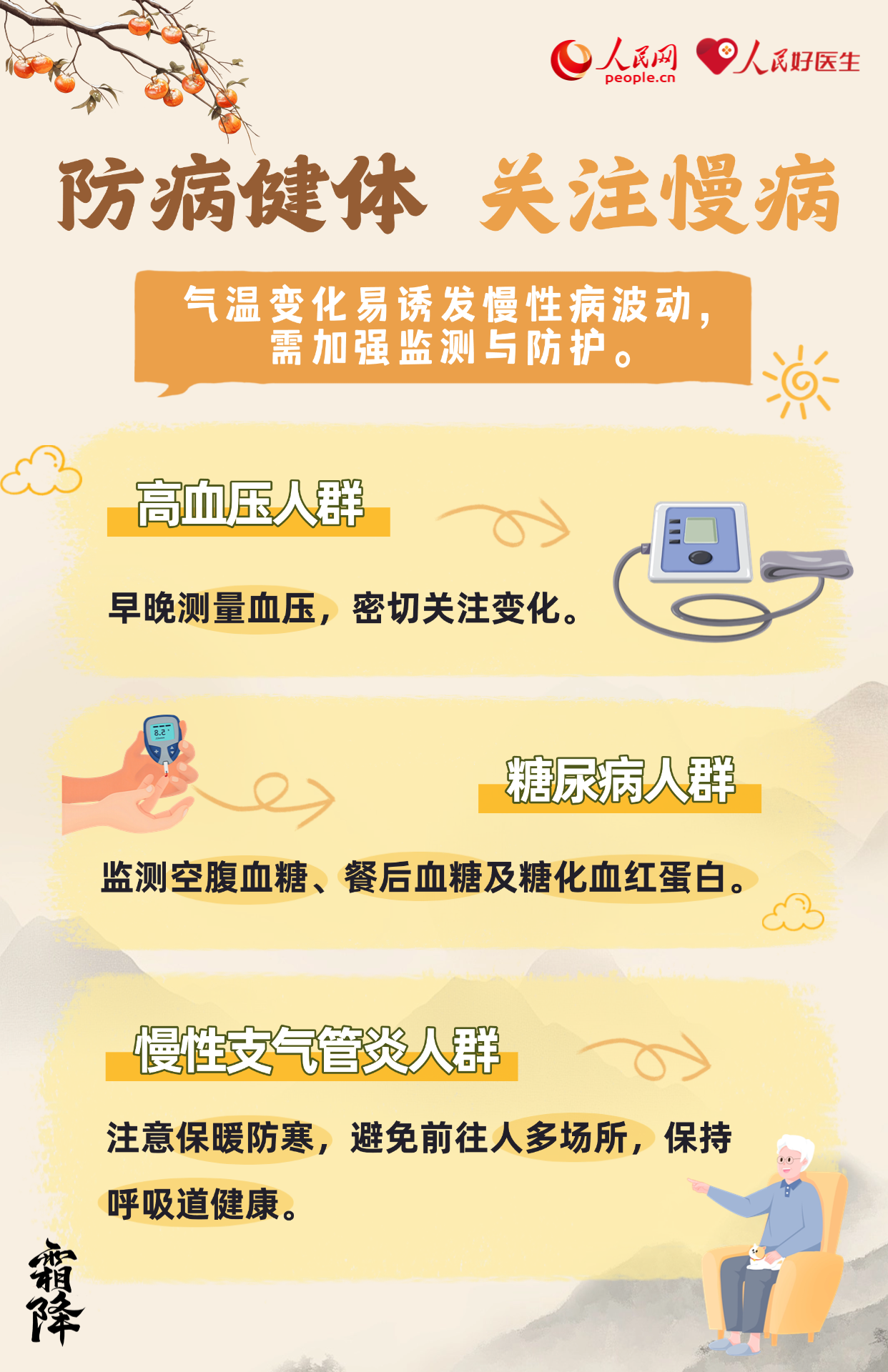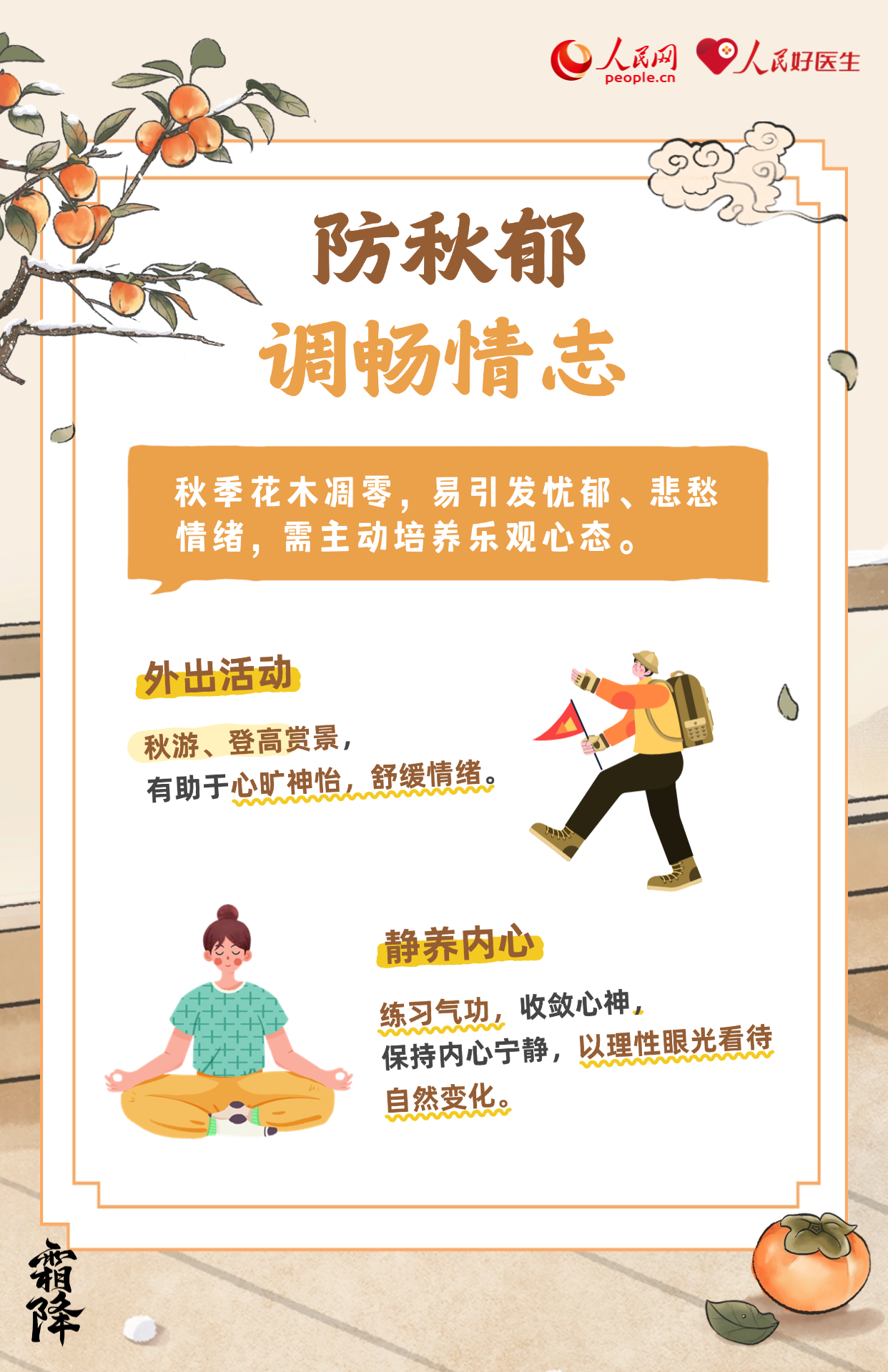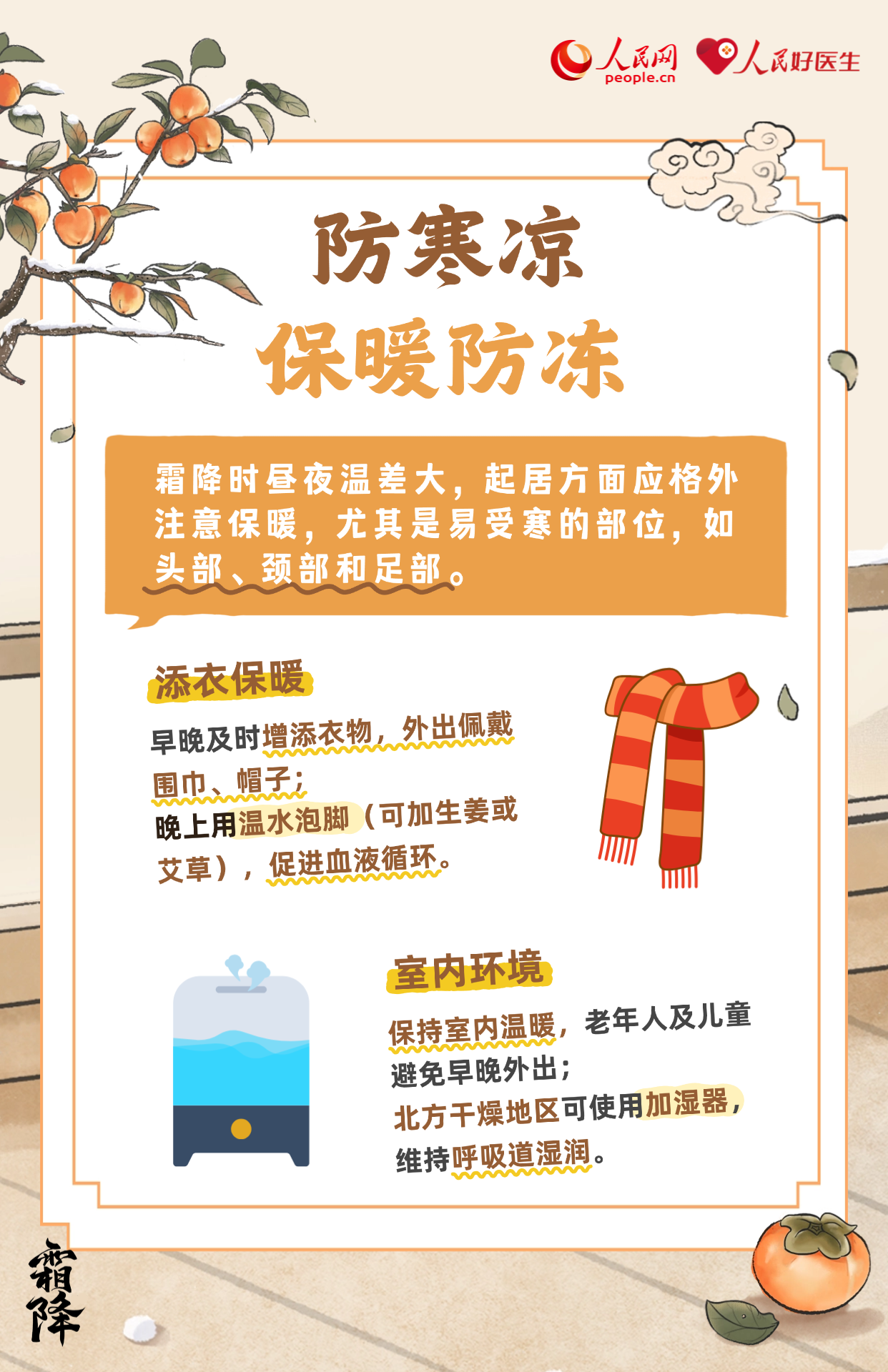 霜降,是二十四節(jié)氣中的第十八個節(jié)氣,也是秋季最后一個節(jié)氣。氣溫驟降、晝夜溫差大。養(yǎng)生當以“防寒潤燥,滋陰溫陽”為重點,此時節(jié)要做好養(yǎng)生保健,無論起居養(yǎng)生還是運動調(diào)養(yǎng)都應(yīng)謹慎,湖北省中醫(yī)院治未病中心主任醫(yī)師楊帆為大家?guī)砩钋镳B(yǎng)生攻略。